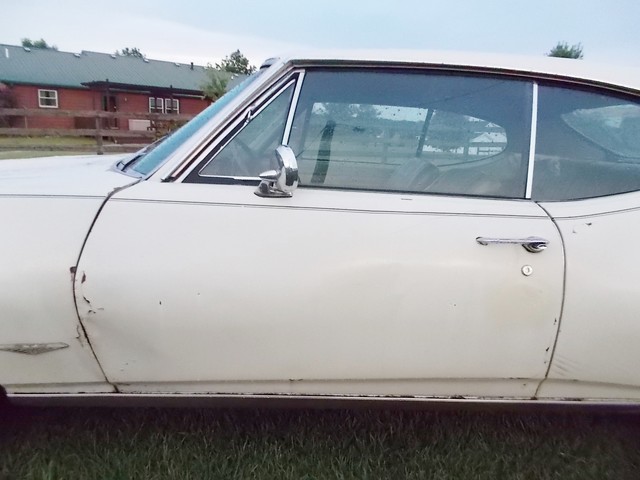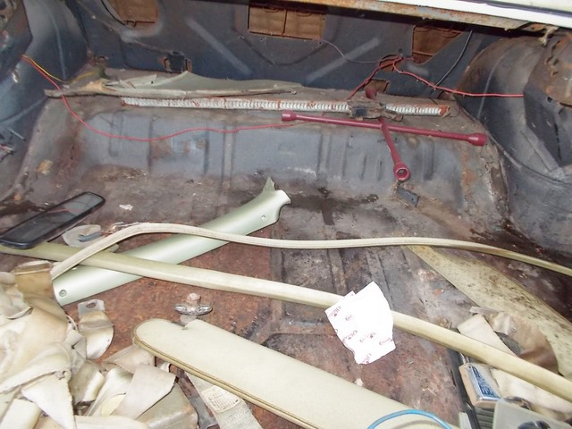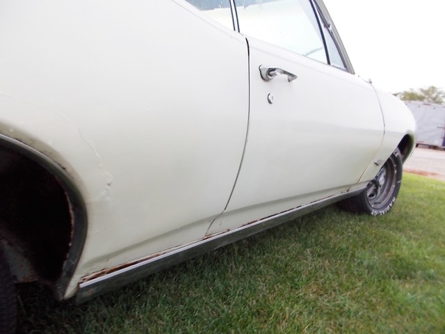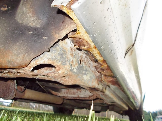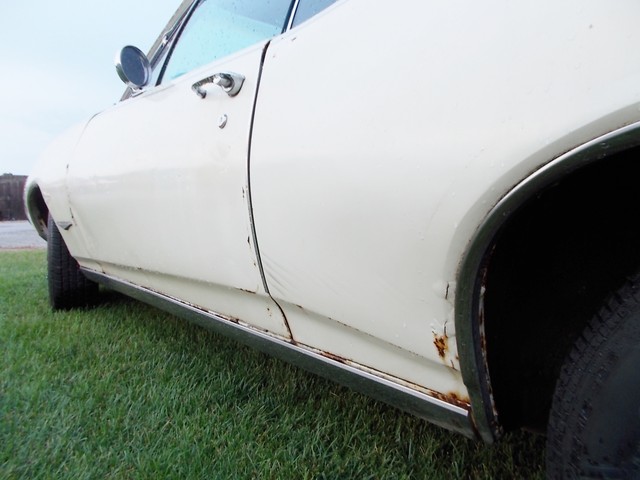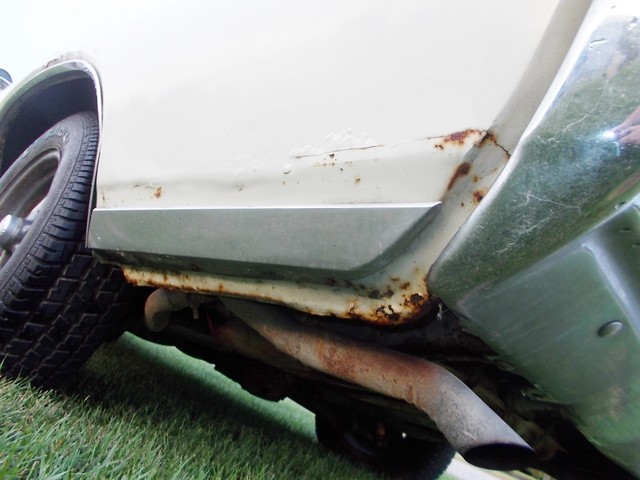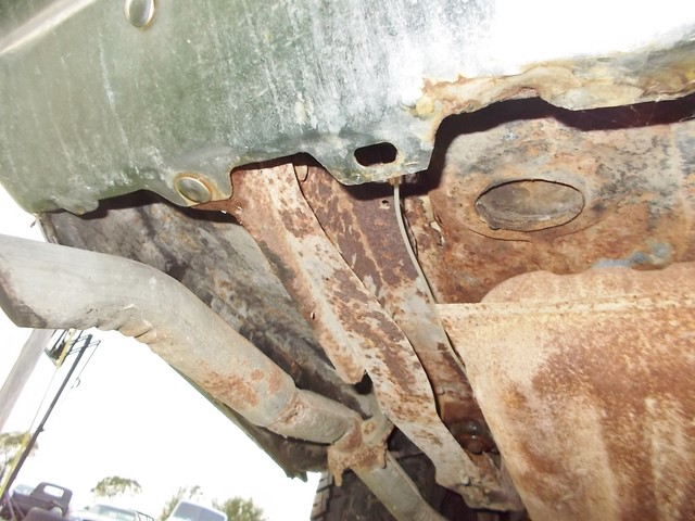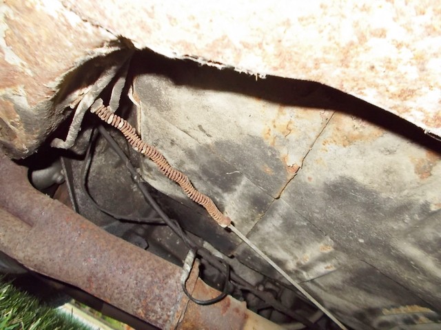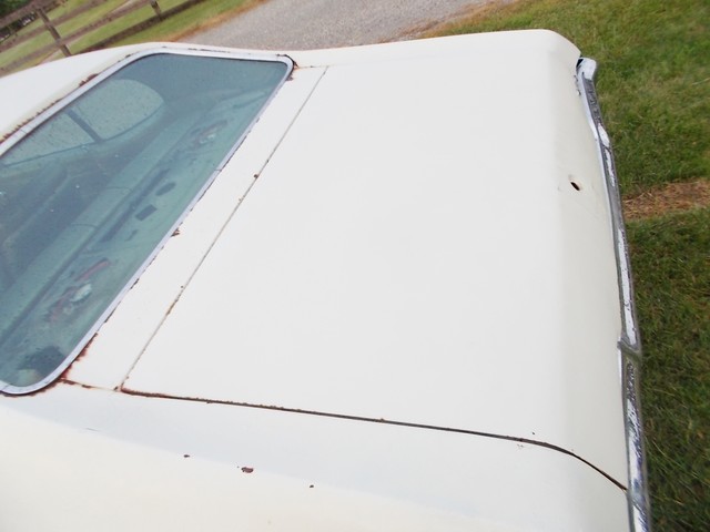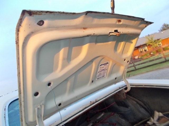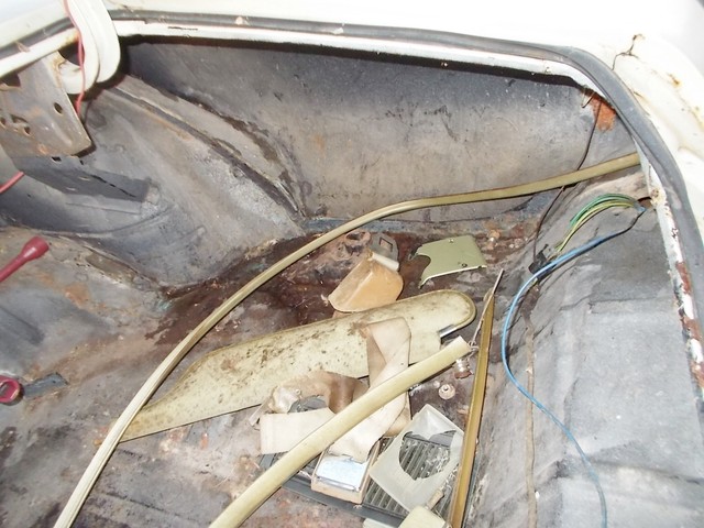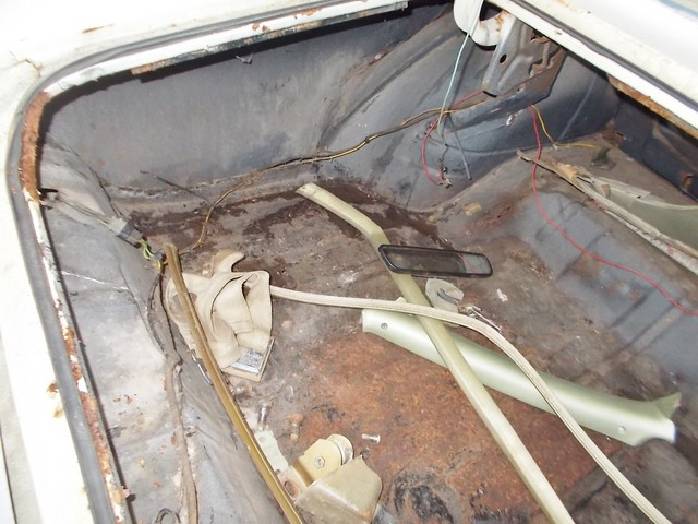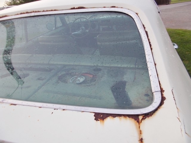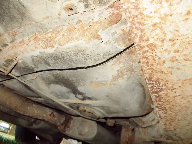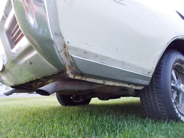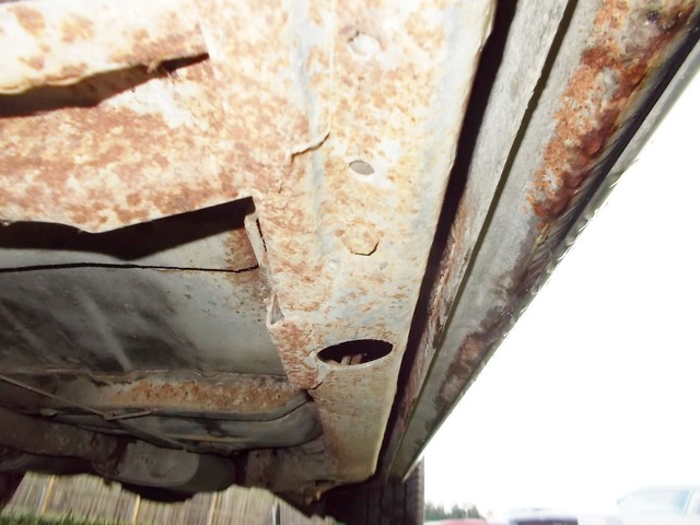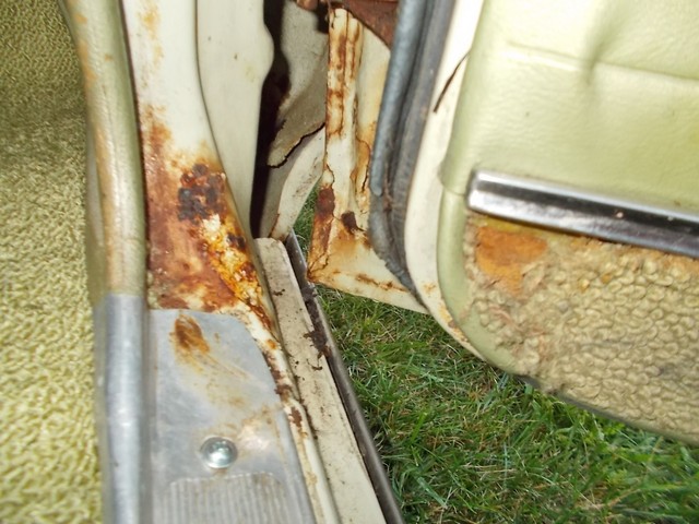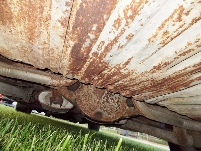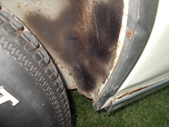 ONE SMALL HOLE IN FRONT DRIVER FLOOR, COUPLE SPOTS IN TRUNK BUT SMALL PATCHABLE AREAS. FRAME IS GOOD. DRIVER FENDER AND DOOR IS DAMAGED BUT WORKS GOOD. HOOD IS NEEDED BUT A GUY COULD PATCH IT. TRUNKLID LOOKS GOOD EXCEPT THE AREA AROUND TRUNK LOCK HAD A PATCH JOB DONE FOR SOME REASON. TOP IS GOOD. LOOKS RUSTY AROUND BACK WINDOW BUT ITS SOLID EXCEPT MAYBE 2 ONE INCH AREAS. QUARTERS ARE NOT ORIGINAL BUT YOU WILL LIKELY WANT TO PUT SKINS ON BUT AGAIN, PATCHABLE. ALL INNNER PANELS LOOK REAL GOOD. PASS ROCKER HAS A 6" AREA OF RUST. AND CAR IS A LITTLE MOUSEY SMELLING.