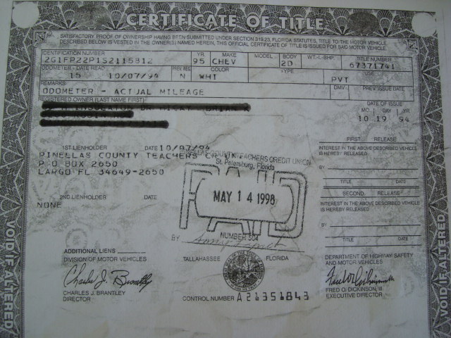 Original Certificate of Title. Florida One Owner Chevrolet Camaro Z28