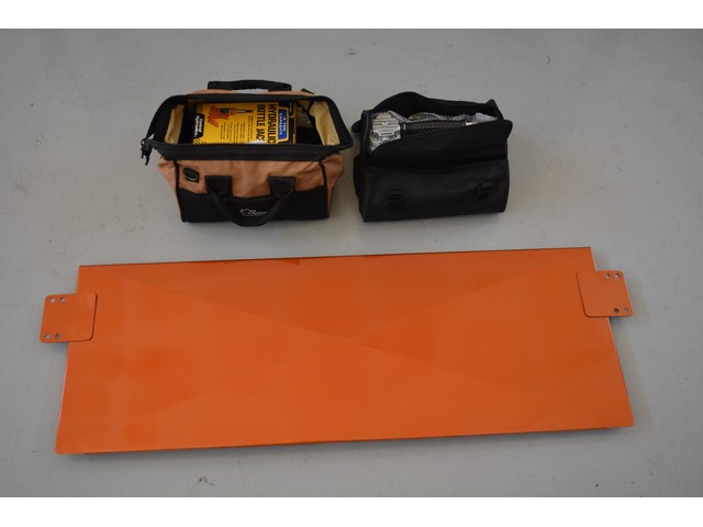 Two storage bags under the seat that contain a hydraulic jack and compressor