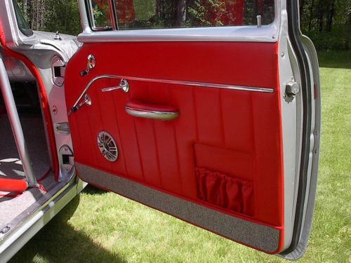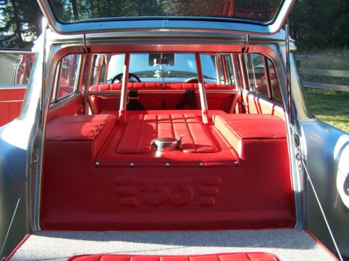Interior: Sound deadener applied throughout the wagon including the firewall. The interior is very well insulated. Red leather on seats and rear panels. Headliner and door panels are high grade vinyl. Carpet is gray high grade Mercedes Benz type loop. The back portion of the wagon has two storage containers to hold the battery and the other for storage. RCI 5 point harness, Custom Rod gauges, Moon fire extinguisher, JVC stereo with 4 speaker system, 300 Watt amplifier, I didit tilt steering column, Billet wheel.