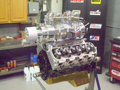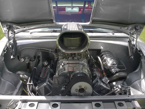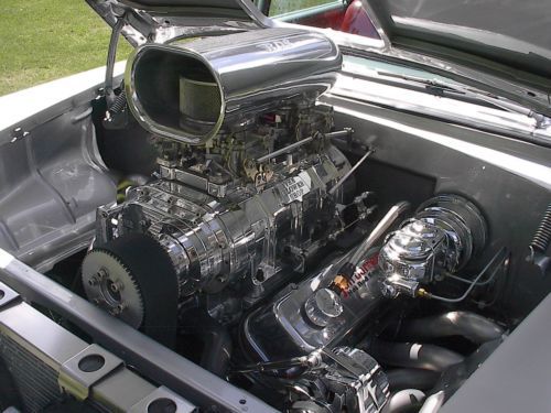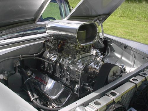 Engine: 502 ci, Jon Barrett BBC, balanced, forges steel crank, 8.5 to 1, forged aluminum pistons, molly rings, forged steel I beam connecting rods, Comp cam hydraulic roller. Heads are PRO top line (RHS) aluminum. 119cc chambers, 2.25 intake, 1.88 exhaust, parts matched and blended, aluminum roller rocker arms. Solid engine mounts. Twin Edelbrock 750 cfm carbs, under driven 8-71 Supercharger (The Blower Shop), Magnafuel pump and aeromotive filter and pressure regulator, SS braider lines, 20 gal fuel cell with polish aluminum locking fuel cap. Electric fuel pump is recirculation. The engine is currently running at 5 to 7 Ibs boost.