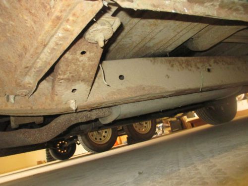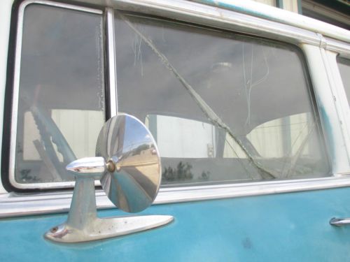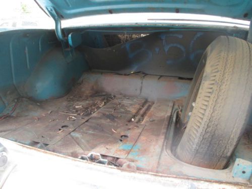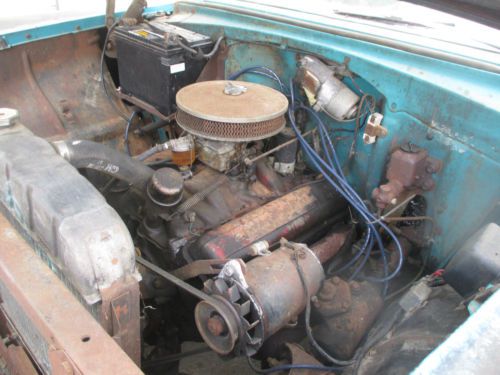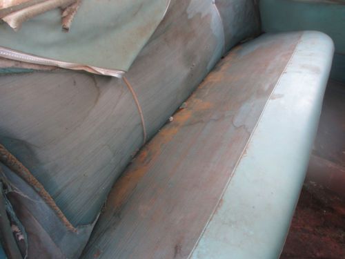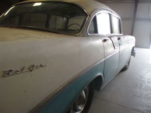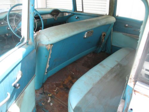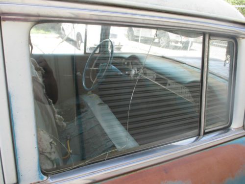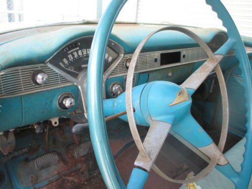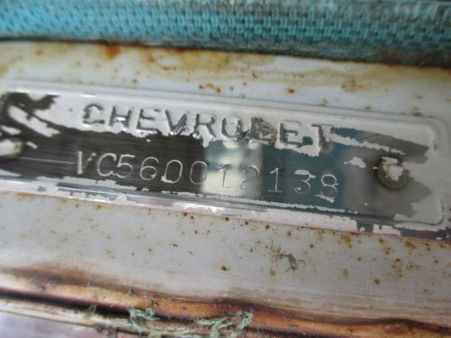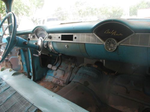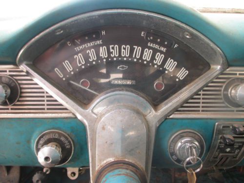 This tri-five classic starts right up, shifting into all gears with ease, with lots of life left in the clutch pedal. The drum brakes stop the car great and promptly. All lights are in working order with the exception of the reverse lights, horn is loud and operational. As presented in its original condition, 3 of the door windows have sustained cracks over time. All windows roll up and down smoothly, doors open easily and close solid. Interior upholstery is original and in need of restoration, but all the seats, hardware, and seat springs are intact. The floor pans have surface rust, while the passenger front floor pan is in need of repair (a 3-inch area that is a bit spongy). Frame rails are solid with no damage or major rust. Body lines are straight with no major dents. With a minor dent in front driver headlight bucket, and one or two on the roof.