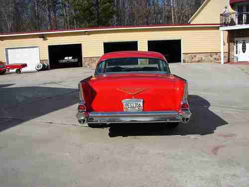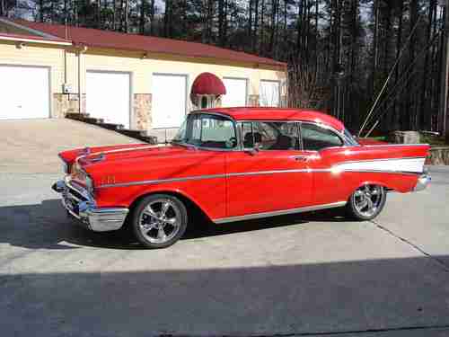 This is a 1957 bel air hard top.. Its powered by a 350 small block with a 350 turbo transmission.. It has power steering, power 4 wheel disc breaks, cold AC, chrome tilt wheel. It has new tires and wheels.. The paint is in good condition no dents or rust.. The interior is in good shape. This car has been frame off, very clean underneath the car.. NO rust.. Drives and looks great! If you need more pictures call me at 678 763 5591
