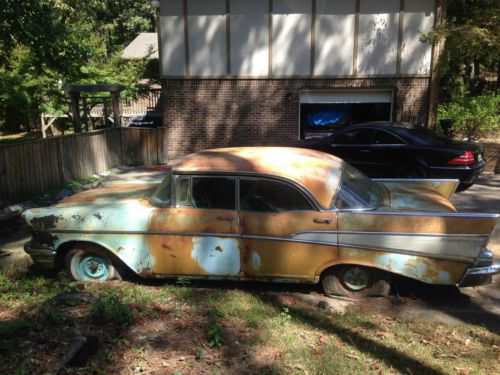 1957 Cheverlot Bel Air 4 door Hard top. This is a all original 283 V8 4 door hard top Bel Air. I have all original parts, trim, interior, hub caps etc. Car is unrestored. Was drivable about 15 years ago when is was parked out side and weather left it in the condition seen in photos. Rust is all over and floor pans are rusted through. Body seems restorable with exception of trunk lid which is rusted trhrough. body panels are fairly straight with only a few bad places on the front fenders. All glass is good and very usable. All doors open and close well. Windows roll up or down. Engine will not start, due to starter not engaging. Motor is good to best of my knowledge. Electrical is intact. 6 Volt electrical system. Stock air filter and jack. This is a completly stock and unmolested car driven by my great grandmother for most of its life. Probably never left the neighborhood while she owned it. color was larkspur blue with white top. Seats still have original seat covers. Most interior parts are in poor condition. Plastic parts are good but fadded. All handles, arm rest and seat plastic trim/covers are intact and usable (not Pictured). This car has been in my family from 1957! If its not in the picture I probably have it. This is a rare car, I would love to see it restored. Just to much for me to take on. Feel free to ask any questions, thanks for looking! Can Provide additional photos. Can Aid with shipping. Car wil be sold with bill of sale only. please check with your state laws in reguads to title process of vintage cars. Not responsible for taxes or fees that may be due for retitle of vintage vehicle. Feel free to ask any questions, thanks for looking! vin VC57A156268 assy atlanta georgia, body AG 5564, trim 672, paint 795a