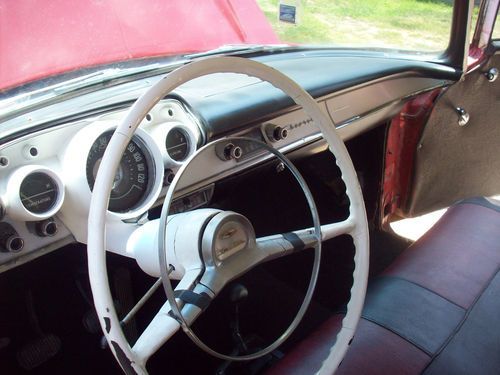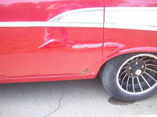 you are bidding on a 57 chevy belair 4 door sedan, was most likely a 210 new, looks like it has been FIXED UP A COUPLE OF TIMES BUT NEVER RESTORED, this is a running driving car, it has 2 cracked side glasses with a replacement one for the passenger rear door. car looks pretty good from a distance but needs some body work. there is some rust in the bottom corners of two of the doors, it has had the outside rockers replaced but needs inners if you so desire, if going to be a driver car then i would not replace them. the front floor pans have been patched with flat metal, the rear floor pans are in good shape as is the trunk and spare tire well, the rear trunk tail pan has also been replaced, the bottom of the fenders have been repaired and have no issues of any problems coming back. the right rear quarter has been hit at one time in the last 55 years and bondo put in, it needs either redoing as it is turning loose or a small section replace in the quarter, does not appear to have any rust on either quarter, the right hood hinge needs replaced, car has a cheap shifter in the floor, enough said, car has a 1980 305 long block installed with low milage with NO leaks,, exhaust manifolds are also original to the 57. interior looks nice but again is driver only not a show car, headliner is in good condition but needs a little professional tighnening up and the area between the doors where headliner material is needs retacking and needs all windlace installed, there is none in the car, package tray is carpet and looks ok, stainless is all good except for three pieces that have had screws installed, ye haw, brakes work with a pull to the left but pedal is great, has recently replace brake hoses, beyond that i dont know, transmission works perfect with no leaks and the rear end is a 3.55 ratio with no humming or crying and no leaks, tires are fair wheels look nice, duel exhausts sounds quiet but mufflers are tired, front end checks out with no slack in ball joints or tie rod ends, bushings are cracked some but not gone or bad enough to replace if staying in a driver condition car, there is no heater blower motor or housing for blower motor but heater core is there and not leaking as it is hooked up. car still retains its original 57 radiator with the honeycomb core and does not leak or run hot at all. bumpers will need rechroming and there is an extra one for the front the original antenna is with the car also but the fool put the hole for it in the left fender instead of the right one. the head lights work and the tail lights also but no brake lights. no turn signals either. gauges work but no idiot lights working. if you should have any more questions i will answer them on email . since pics have been taken, chevy corvette rally rims have been installed