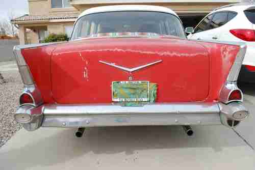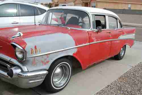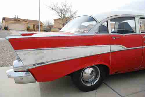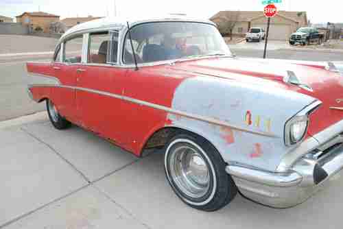1957 Chevy Bel Air 4 door with 327 3 speed on the floor standard. Runs good, drives good. Can restore or daily driver. Solid body. No rot in trunk, floors, quarters or fenders. Only rot is on the 2 outer rocker panels, which can be replaced at about 120. apiece. New dual exhast, engine back, new shocks. Seats are old style diamond tuck. there are tears on the seats. All chrome moldings are intact. Dash looks good, uncut dash. Clean New Mexico title in my name. I accept paypal only. Buyer is responsible for all arrangements for delivery and or shipping.