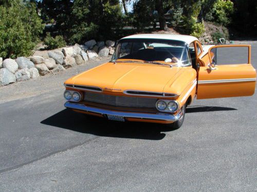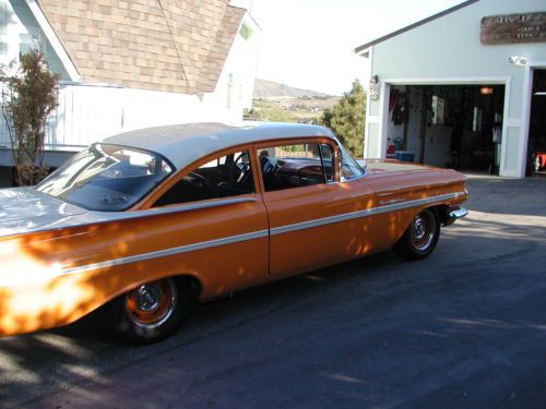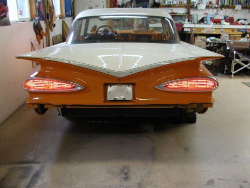 Forsale is my 59 Bel Air that I just completed. I did not install the secret audio behind the seat yet do to medical problems , amp, CD player, and complete unit and wired to the trunk ready to install. This car has new everything except engine which is a 94 camaro Z28 LT1 with approx 80K miles and runs strong. Motor has new MSD dist, 52MM holley throttlebody KN air intake, water pump, Howell fuel injection harness, 605 steering bx, new 4l60e electronic trans, lokar shifter, griffin radiator, marathon 2500 cfm electric fan . Auto electric wire harness, Dakota digital analog VHS gauges. 2006 leather electric bucket seats new tires, corvette wheels front disc brakes with 2 inch drop spindles, springs, abco 1 1/8 sway bar, new rear brakes, 95 chevy gas tank with new fuel pump,dakota digital led tail lites all new chrome and stainless, all other metal podercoated including side trim and interior garnish. Complete new paint done in orange sherbet and bisque known as creamcicle or 5050 bar and dreamcicle. This car drives and looks awesome. 60K invested plus lots of man hrs. please do not bid if you can not buy. Please come look or hire a person to look for you.