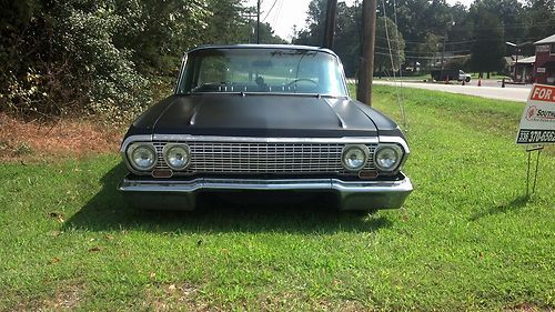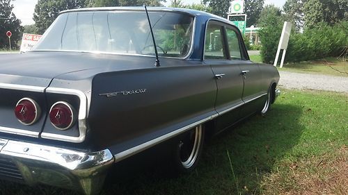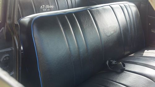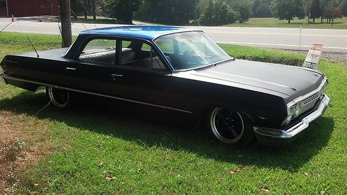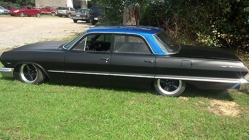 (THIS IS A RE LIST I HAVE TO SALE THIS CAR OR TRADE FOR A WRECKED BUT RUNNING HARLEY EVO I NEED A MOTOR AND TRANS FOR MY NEW BIULD IF YOU CAN HELD CALL 336-404-9428) for sale is a 1963 belair 4 door its been lowered with all new upper and lower control arm bushings and ball joints on both sides inter and outer tie rod ends on both sides sway bar bushings wheel bearings on both sides idler arm new brakes on all 4 wheels new fuel tank new exhaust with hooker huger headers. it has a 350 turbo trans the motor is a 283 that was rebuilt about 15 or 20k miles ago. its had new spark plugs, wires, cap, button, points, coil, intake gasket, valve cover gaskets, carb and alot of chrome this car runs strong and is great for cruising around. the car was painted about 3 weeks ago with a base clear mat black and base clear ppg pearl blue. the upholstery was done before i got the car its a nice two tone black and blue leather that matches the outside of the car great. to finish it off i put a new set of 17" ridler wheels and tires. over all this car has been done from front to rear top to bottom i drive this car every day and would trust it to go anywhere. if you have any questions you can call me at (336)404-9428