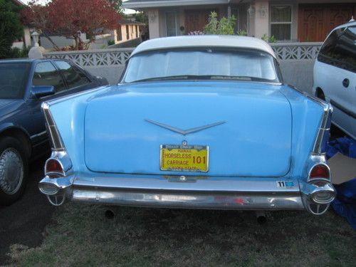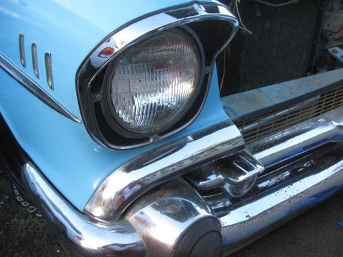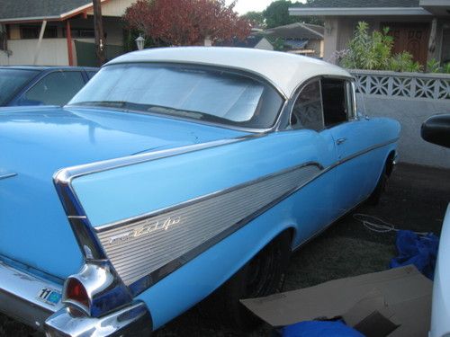 This1957 Chevy 2 door Belair Hardtop was in storage since 1992, the brakes were stuck from sitting too long, I replaced the two front wheel cylinders, cleaned and repacked both front inner and outer wheel bearings and replaced both front wheel seals, front and rear shoes and all four brake drums were cleaned, the original brake assembly are in good condition, the engine was primed with oil before starting the motor with fresh gas, I replaced the carburetor with a Holley 650 DP #4774-2, the distributor is a Mallory Dual Point, I was going to install a new MSD HEI with new wires that I bought for another project that I recently sold but I'll leave as is for new owner to decide, the valve covers with wire loom holders and matching air cleaner were just put on to replace ALSTON valve covers that were originally on motor, the motor was rebuilt to stock before it went into storage, the interior is leather with cloth inserts and in excellent condition,the headliner has the same pattern as the seats, the door panels does not have the matching cloth but also in good condition,the dashboard is also padded,the body is in good condition with minor surface rust and decay but not critical that it will need major cutting and patching, the stainless trims on the car is in excellent condition but the chrome bumpers and light bar are pitted, Danchuk has these replacements readily available as well Speedway Motors and others that sell Tri-five parts, I honestly can say this car was well taken care of before it went into storage, car is for sale locally and will be cancelled anytime before the auction ends, I will answer all questions you have, I will assist to deliver car for shipping and help to get booking for immediate sailing to your destination, see my feedback, I have sold cars as far as Germany- a 1931 Ford Model A Roadster dlx. and 1952 Chevy coupe to Georgia, both without problems and assisted buyers with booking and shipping see feedback, this 57' Chevy Hardtop belonged to my oldest brother and passed down to me, he bought himself a ZO6 Corvette to enjoy during his retirement, please be serious when bidding and have funds to pay, get approvals from your spouse, and bid to win! thank you.