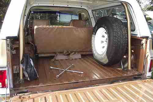 Seats are original and have some splitting from age, dash has a few cracks, floor is sprayed with a bed liner material and has no carpet.
