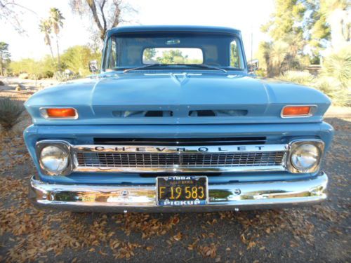 Life Long Black Plate California Truck! Rock solid and rust free. Restored frame up. Runs and drives excellent! Rebuilt stock 230 CI engine with a sweet sounding split manifold and dual exhaust. The engine is very clean and shows well. Power steering allows for ease of handling. New bed wood and rails. New fuel tank. New chrome. New door and window weather seals and window whiskers. Glass is perfect. AM-FM Radio. No signs of any hit damage or patch panels. The paint is a bright blue like stock and is laser straight. There are a couple of nicks in the paint that you have to look closely to find. The shifter is located on the floor. I showed the truck for the first time last week-end 2/24/14 and five independent judges awarded it a first place in its class. You will not find a more purer, unmolested 1964 body. No disappointments here. NO TRADES. Please call me (I do not text) at 520-245-2983 or e-mail me with any questions you may have.