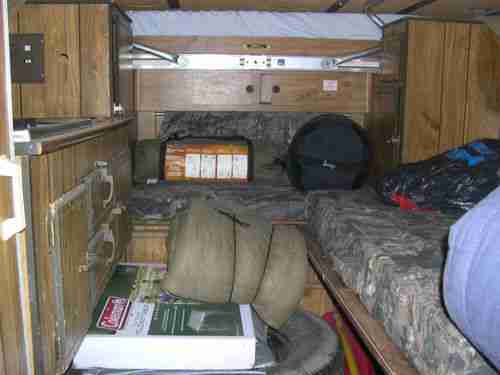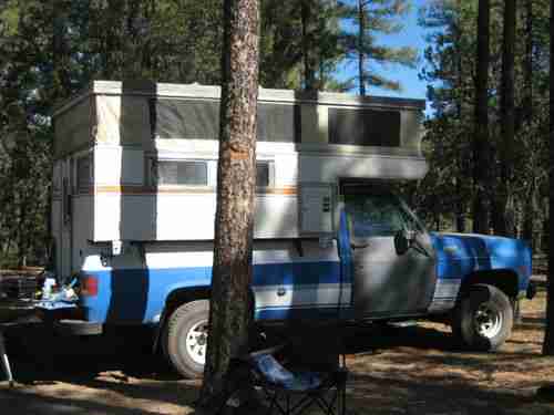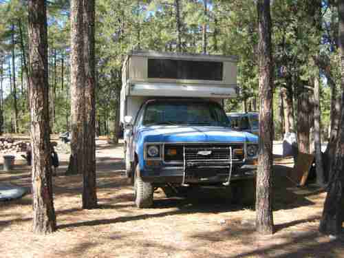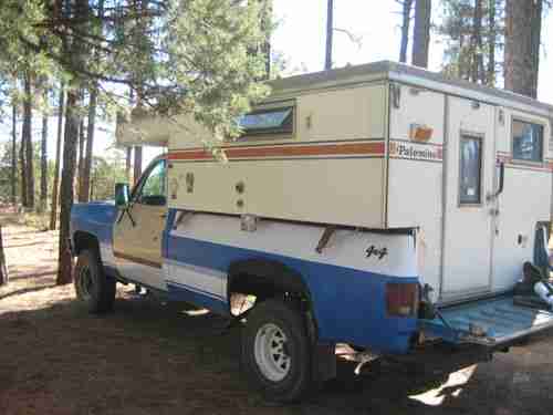 Included in the sale/purchase of the truck is the Palomino pop up camper, canvas is in good condition, has a 4 burner stove,old stile ice box frig, inverter as you can run lights and plug ins from a 12v battery or 120v hook up, potable 10gal tank pump is not working but it holds water, new covers on cushions. Table lets down to make a bed for 1 person, and 2 can sleep on top, sleeps 3 comfotably, and it has 3 manual crank camper stands. I resealed around the windows and the top last year. The camper also is not pretty but will keep you warm and dry. The pictures are from this past November 2012 on a deer hunt in Norther AZ. Thanks for looking