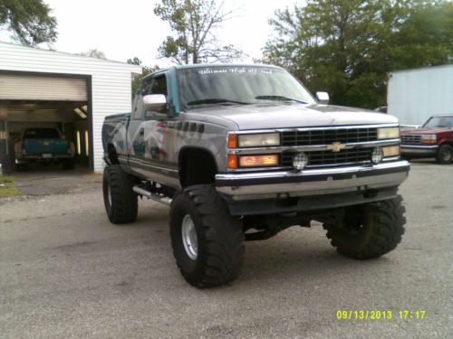 1993 CHEVY K1500, 4X4,HAS BACK SEAT 6INCH SUSPENSION LIFT, 4INCH BODY LIFT, LATE MODEL 454, BORED 40 OVER,RV CAM, 4 BARREL,TURBO 400 AUTO, 205 TRANSFER CASE, 14BOLT FRONT AND REAR DIFF. LADDER BARS, 40 INCH MUDDERS, ALUMINUM WHEELS. INTERRIOR IN GOOD CONDITION, EXTERRIOR HAS A COUPLE SPOTS THAT NEED SOME BODY WORK, PAINT WORK, I WOULD SAY IT WOULDN'T HURT TO REPAINT IT. THIS IS A REAL NICE TRUCK, THE MOTOR IS WAS REBUILT RIGHT BEFOR WE TRADED FOR THIS TRUCK. SO THE MILES ON THE ODOMETER IS NOT CORRECT. WE ARE WANTING $6200.00 CASH ONLY AND YOU WILL HAVE TO COME PICK THE VEHICLE UP FROM US. OUR NUMBER IS #317-782-9309 YOU MAY CALL AND ASK FOR TOBY OUR ADDRESS IS 2173 BLUFF RD. INDPLS,IN 46225 YOU MAY COME LOOK AT IT AND TEST DRIVE IT AS WELL.