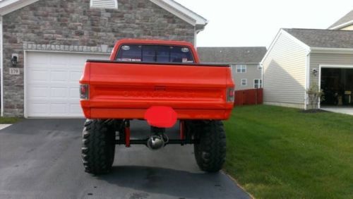 1979 CHEVY,LIFTED AROUND 9 INCHES,3 BODY AND 6 SUSPENSION,ALL NEW,HAS REALLY NICE I BELIEVE CHEVY ORANGE PAINT,39.5 SUPER SWAMPER TIRES AND WELD RIMS,NEW CARPET,RADIO,ALL EXTERIOR TRIM IS NEW,CUSTOM FRONT TUBE BUMPER,HYDRAULIC TILT DUMP BED,SEMI TRAIN HORNS,