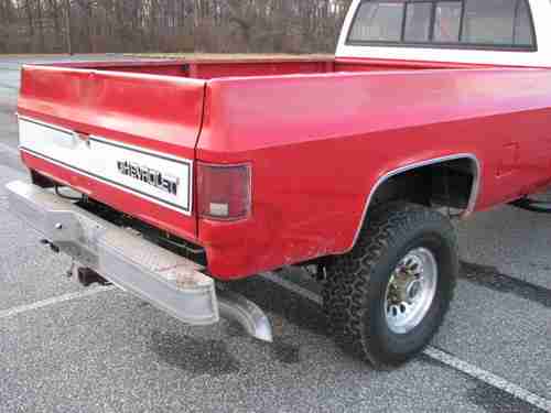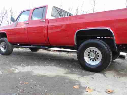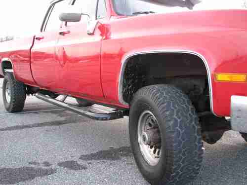 1988 Chevy Crew Cab 4x4 K/V30 heavy duty 1 ton with a 1st gen. Cummins turbo diesel. I bought the truck with a blown 454 and put in a low mileage drivetrain from a '92 Dodge truck. The Dodge title (which I have) and odometer read 29K. As for the body and chassis, I don't know exactly how many miles it had but would figure about 200k. Since the conversion i have put about 10-15k on it. I drove the truck for several years after putting it together and it ran very well. The truck has been parked for a few years, during which time the rocker panels and cab corners were replaced. I have painted those areas of the truck but it could use a complete paint job if you want a super nice looking vehicle. The clear coat over the red is rough in some places. It has a very solid body but does have some dents and dings. There is light surface rust in a few areas on the frame and the body. Take a look at the pictures and it should give you an idea of the rust. I raised the body 3 inches to clear the engine and installed new body mounts at that time. The floor pans are solid, however the inside portion where the rocker attaches to has rusted through in a couple places. I sand blasted and repainted all the metal behind the rocker panels and cab corners. This truck was originally sold as a cab and chassis setup, bed was added by previous owner.