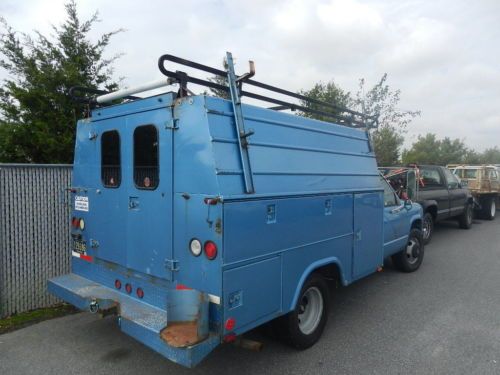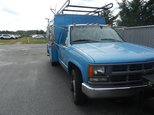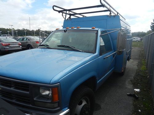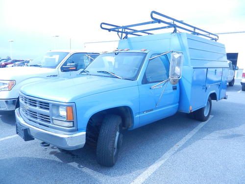 NICE! 1996 CHEVY 3500 DUAL WHEEL 2WD ENCLOSED UTILITY BODY. RUNS , RIDES, AND DRIVES WELL. TRANS SHIFTS SMOOTHLY. INTERIOR AND EXTERIOR OF CAB ARE IN GOOD CONDITION, BODY IS STRAIGHT. CARFAX CERTIFIED ONE OWNER COMMERCIAL TRUCK SHOWS TO BE WELL CARED FOR AND MAINTAINED. A/C IS COLD, LADDER RACKS, AND THE ENTIRE UTILITY BODY OF THE TRUCK ARE SOLID, SOME ISSUES WITH SURFACE RUST AND PAINT ON THE BUMPERS AND LOWER PORTIONS OF THE BODY FROM YEARS OF USE AND WEAR. ALL AROUND GREAT TRUCK CONSIDERING ITS AGE AND MILES. STILL ALOT OF LIFE LEFT IN HER!