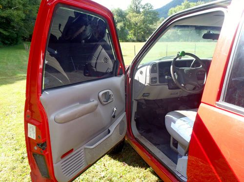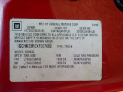 This is a very basic, heavy-duty pick-up truck; basically a commercial-type vehicle- no bells and whistles on this one! Has always met inspection certification in NC and regular maintenance. There are no major mechanical problems or issues- unless you consider the air-conditioning not working well... Where we live, we really don't need air too often, so not a big deal to us- all the windows roll down! The engine does not leak oil, does not run hot at all, and there are no leaks. The engine smokes just a bit on start-up, but goes away quickly. There is a small squeal from the power-steering unit possibly at start-up, but it goes away after a few minutes. Automatic transmission is strong- never any issues shifting or idling. Long-bed 8-foot (10-foot with the gate down, with sprayed on dura-liner), shift on-the-fly 4-wheel drive (no getting out of the cab), 5.7, gasoline engine. I've used it as a farm truck for about 6 or 7 yrs; bought it used, to pull my horses around, haul gravel, haul hay, feed, dirt, pull tractors and drive in deep snow and on ice. It excels at all of these tasks, and then some, but it's a little rough- like I said, we use it as just a farm truck, but is completely street-legal- no modifications are necessary. There are defects you might expect on a truck of this age- the tailgate is bent and must be opened by pulling on a 'redneck-release' chain (unless you put a new gate on, of course), and there is a small dent in the driver's side rear door, but it is even hard to tell in the pictures. Overall, I'd say the red paint is in fair to good condition for a truck this age, and although I haven't waxed it in a few seasons, she shines up perty good! There is no major rust anywhere on the truck- not deteriorating anywhere on the main body that I can see, except just a bit on the tailgate (see pics), which one would probably want to replace or just take off completely, anyway. All the windows are tinted really dark, and they are ol' fashioned hand-cranks, not power windows. The locks are power-locks, but they don't work; should be a quick fix for someone with know-how. The truck as air-conditioning, but as I mentioned above, it doesn't work well. The fan moves air but there probably is a small leak in the system and it does not blow cold. Heater seems to work fine. There are a few rips/tears in the front seat on the driver's side vinyl bench seat- we've used duct tape to hold it together and it works fine; a bench seat cover would be great and no one would ever know. The rear seats are also bench- no holes or rips there. All safety/seatbelts are all there, and all work. The rear hitch is heavy-duty and the truck also has power-assist 6-point hookup for pulling multi-axle trailers with brakes. The spare tire is in excellent condition and the jack/crowbar pieces are all there. This model Chevy K3500 was also available in a dual-rear-wheel, but this one is Single Rear Wheel (SRW), and I prefer it over the dually for driving the narrow mountain roads around here. The tires aren't real good; maybe only 10% left, but are 10-ply E-Class and will get you home within a reasonable distance. The last few sets, I've only put used, retreads on it since it gets such little use, for short distances only. The wheels are the stock OEM rims, painted black- no dents; the front brake rotors are new and the brake pads/shoes are relatively new, too and work well here in the mountains- no pulling or thumping. There is a sound system installed, but the front, driver's side door speaker is missing and the head-unit CD function doesn't work. All lights, turn signals, horn, interior and gauge lights all work fine.