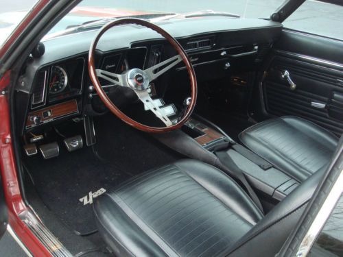 Center Console Air Spoiler Equipment Positraction Axle Power Disc Brakes 4 Speed Transmission Comfort Tilt Steering Wheel Power Steering AM Pushbutton Radio Special Ducted Hood Rally Sport Equipment Garnet Red Paint Black Vinyl Trim Strato Bucket Seats Front Shoulder Belts Carpeting, Lighter Head Restraints Concealed Headlights Special Grille Wheel opening moldings Bright exterior accents Special Features: Vintage Air Conditioning, Tilt Steering Wheel, Teak Steering Wheel, Gauge Package, Center Console, Baer 4 Wheel Disc Brakes, Slotted rotors, Tubular Upper Control Arms, Polyurethane Bushings, Heavy Duty Sway bars, 12 Bolt Posi Rear End, 17" Torque thrust Wheels, Flowmaster Exhaust, Hotchkis 2" Drop Springs, Z28 Badging, Z28 Valve covers, ZL2 Cowl induction Hood and more Engine Build Details: Original 350 Block that was in the car when new. (it has been decked so, unfortunately, the original vin stamping is gone) Eagle Steel Crank 383 kit Dart Iron Eagle 202-15 Heads Ported and Matched Stainless Valves and hardware ARP Bolts and much more....Full details available along with receipts. This car runs and drives great. It sounds amazing and produces a giant amount of power. The Audio has been upgraded to a Pioneer Premier Super Tuner, AM/FM, CD, Bluetooth, XM Satellite, MP3 with a JBL 500/5 amplifier and subwoofer concealed in the trunk against the seat back. Please ask any questions you may have prior to bidding. If you have less than 5 feedback, please check with me prior to bidding. I encourage you to inspect the car in person prior to bidding. I have done my best to be thorough and accurate, but I am always happy to revisit any area you would like further explanation on. I do not own this car, I am selling it for a friend who has had long term ownership. I can assist with shipping arrangements, but all shipping expenses are the responsibility of the buyer. This car is being sold with no warranties of any kind. Thank you for your interest. |