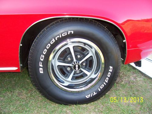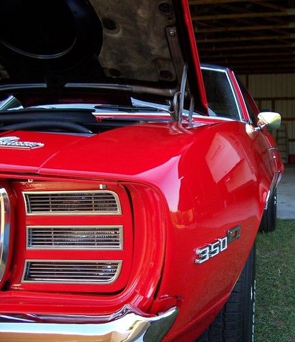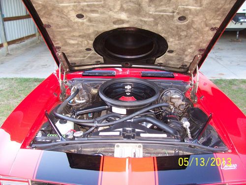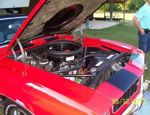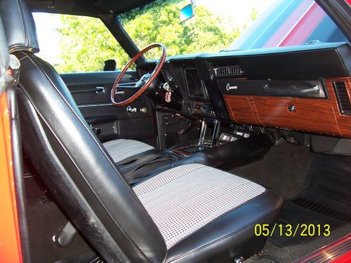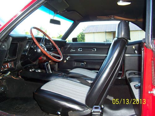 This muscle car is competitive in shows and a pleasure to drive. It has a great body with eye-catching torch red paint and beautiful hounds tooth interior. It sports SS wheels (with a matching spare), a vinyl top, cowl hood, dual outside mirrors front and rear bumper guards and front and rear spoilers. It's engine is a 350/300 with a 350 transmission. The interior package includes factory AC, factory rear window defrost, factory tachometer, factory gauges, working factory clock, deluxe door panels, wood grain dash, tilt steering with a rosewood steering wheel, and AM/FM stereo with cassette.