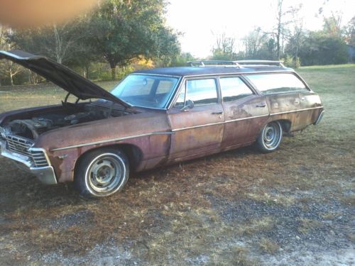 You are bidding on 1967 Bel Air station wagon that will be sold with a bill of sale. I can get a title if interested. The car was own by a buddies mom which she is the original owner. The car has tilt steering wheel, Am Radio, Power steering with Manual brakes and Luggage rack. Motor is a 283/ 2 speed powerglide transmission that runs and drive. The body has it original paint not full of bondo. This will make a great Rat Rod or to restore because you see what your getting. The trunk area has 2 spots, The Back floors and passenger front are nice. The front bench seat needs attention, back seats are holding up. Lower driver 1/4 needs some attention. The tailgate area is super nice and solid. The back window is hand crank that goes up and down. All the door, shut tight like new. There are no rot underneath doors. All glass and chrome is there. Nothing is missing. Everything lights up and work as from the factory.