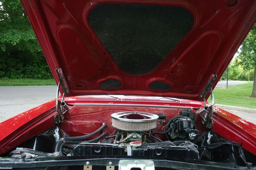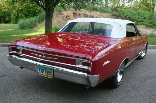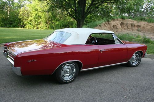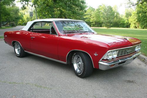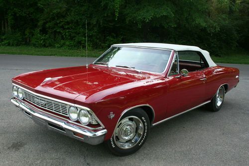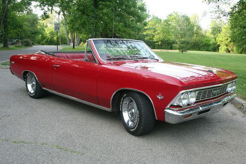 1966 CHEVELLE CONVERTIBLE. THE CAR IS SUPER NICE, IT WAS RESTORED IN THE 2000s ITS THE ORIGINAL COLOR WHICH IS REGAL RED WITH SAME COLOR INT. THE PAINT AND BODY ARE BASE/CLEAR AND WAS LAID DOWN VERY NICLEY. THE CAR WAS RUST FREE TO START WITH WHICH MADE THE PROCESS THAT MUCH EASIER . THE CHROME AND TRIM WERE REPLACED AT THAT TIME AND STILL LOOKS GREAT. THE INT IS VERY NICE HOW EVER THEY PUT IN A AFTERMARKET SHIFTER THAT IS INCORRECT TO THE CAR, IT WORKS FINE. THE NICE THING IS THEY DIDNT CUT UP THE CONSOLE SO IT SHOULD BE VERY EASY TO PUT AN ORIGINAL SHIFTER BACK IN IT. IT HAS VINTAGE STEWART WARNER GUAGES, AND THEY ALL WORK GREAT. ALL THE LIGHTS,TURN SIGNALS,WIPERS,RADIO ALL WORK AS THEY SHOULD. MECHANICALLY IT RUNS SUPER STRONG. THIS IS MY 1ST EXPERENCE WITH THE ZZ4 ENGINE. I WILL BUY ANOTHER ONE FOR MY CAMARO PROJECT I HAVE GOING ON. IT STARTS EASY, RUNS COOL. IT WILL DO A NASTY BURN OUT, ROLLING 30MPH. SQUEEZE THE GAS AND YOU WILL SMELL RUBBER.. THE SUSPENSION IS G-RIDE WHICH CONSIST OF TRAILING ARMS, SPRINGS FRONT AND REAR,SHOCKS, LARGE SWAY BARS. THERE IS NO BODY ROLL ON THIS THING. IT IS ALSO EQUIPT WITH DISK BRAKES,AND A FLAMING RIVER QUICK RATIO STEERING BOX,WHICH IS ALSO POWER. ITS A VERY WELL SORTED OUT CAR. IT HAS A POWER TOP THAT WORKS FINE. THE UNDERNEATH OF THE CAR IS NOT SOME UNDER COATED MESS. ITS PAINTED RED JUST LIKE UP TOP BUT ITS NOT DETAILED ANYMORE. THE CAR GET DRIVEN REGULARY.THE CAR WAS DRIVEN ON THE HOT ROD POWER TOUR BY THE PREVIOUS OWNER, AND I TAKE IT TO CRUISE INS ALL THE TIME. OVERALL ITS A CAR YOU CAN TAKE TO THE CAR SHOW AND DUST THAT MUSTANG ON YOUR WAY HOME. THE CAR WAS PURCHASED FROM A INS COMPANY BEFORE IT WAS RESTORED IT WAS A THEFT RECOVERY THATS WHY IT SAYS "PRIOR SALVAGE" ON THE TITLE. JUST WANTED TO CLEAR THAT UP BEFORE I GET A MILLION QUESTIONS ON THAT. AND REMEMBER THERE IS NO RESERVE..