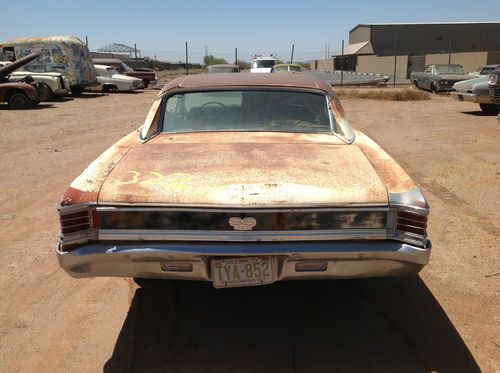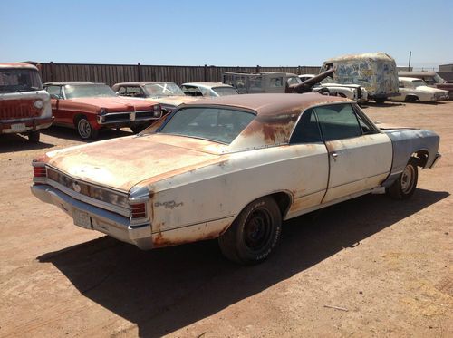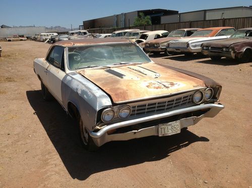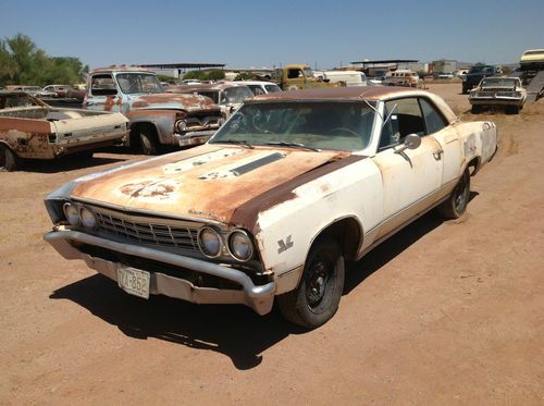 This is a 1967 Chevelle SS 396. True 138 code SS. Just rescued from the Arizona desert. Originally a white car with black bucket seat interior. Currently has small block and 3 speed on the floor. Was a 4 speed car. Lots of surface rust the interior is sunbaked. The floor pans look good from underneath. Not sure on condition of trunk pan. If you have other questions, please call 435-770-3337 Thanks