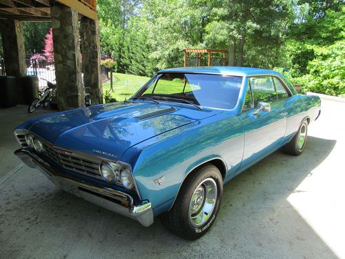 1967 Chevrolet Chevelle , with super slick paint. Body panels line up nice and the car is rust free. The floor pans are solid and rust free, the trunk pan and braces have been replaced. The motor is a 350 runs nice with Edelbrock intake and Holley carburetor. The radiator is new. The car has a 350 automatic transmission in the floor with console changes smooth, with a 10 bolt rear end. The car has power steering and front disc brakes. New carpet and seat covers, new door panels, headliner, interior is very nice. New windshield. Very nice overall car without breaking the bank!