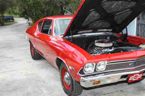 1968 Chevrolet Chevelle: This Chevelle came from Virginia originally, I am the third owner. She is a well documented 32,157 mile only vehicle, with original interior, has new carpet. The guys in Moltier, Georgia took out rubber mat and replaced with new carpet, sprayed her with Madator Red polyurethane paint "beautiful job". Removed old 6cyl. auto trans replaced with 1980 (30) over 454 all balanced now a 461 c.i.d.ground bounder. 11:5 pistons ported and polished heads, correct Winter manifold with 850 dbl. pumper. They change 6cyl. steering column with correct 68, Muncie M-21 four speed numbers 3857584 GM & PO806 also 12 bolt posi rear end number 38757 45N. We replaced all shocks and springs, front and rear and rear sway bar with 69 SS suspension from Year One. Just replaced front brakes, cylinders, springs, shoes, these are Manual Drum Brakes. Been sitting in garage for over a year, my son and I crank her every couple months. Only driven to car shows but it's been awhile. Had apparised several years ago at Classic Car Coating at over $28,000, they were so surprised that there was NO RUST even in the trunk below the rear glass which is a common area.Very RARE to find onethis young to be so old. Reason for selling to further my kids education.