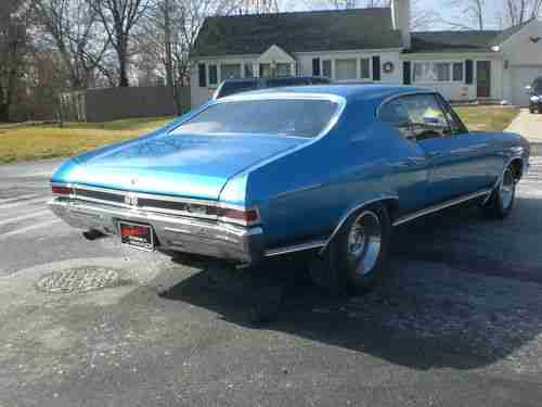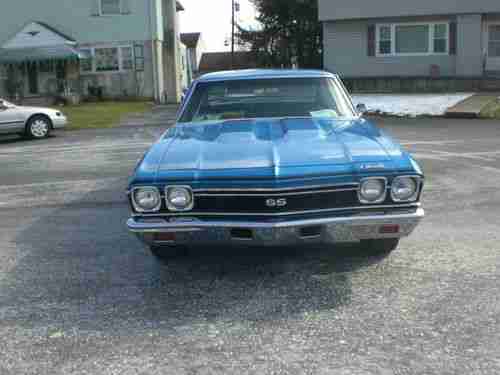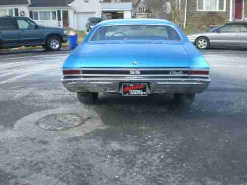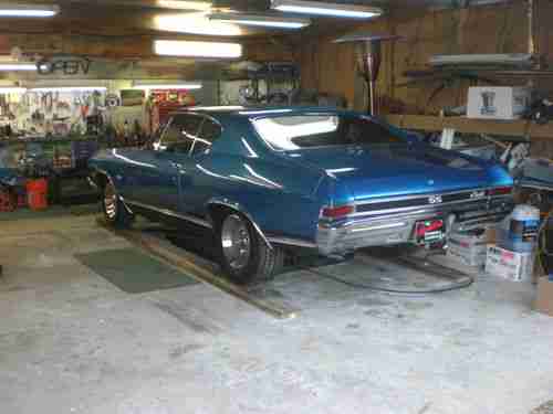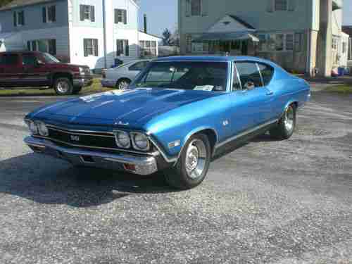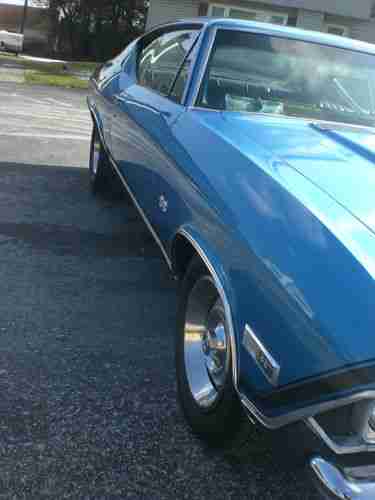 Older restoration, southern car, NO rust - all metal. Original panel car, no patches, no bondo. Floors are perfect in this car - original, same with trunk. All airgaps line up nicely. Glass is in excellent condition. Stainless and chrome are in very good condition. Car has all new interior from ceiling to floors. Dash pad perfect - no cracks. Car has factory tilt column with SS wheel. It has factory SS gauge package and staple shifter with console. Car has very desirable roll tach in dash. This is a factory AC car, it has brand new power booster, master cylinder, stainless lines to prop valve. Discs in the front, drums in the rear, new wheel cylinders, new brakes shoes, new drums, new spring kits. Car has rear sway bar, all new Ibok springs slight lowering, pro touring. New upper and lower ball joints, along with new control arm bushings - upper and lower. It has all the SS trim on it with the exception of the 327 emblems on front fenders. It currently has a very healthy 350 crate motor with a nice hydraulic cam,very nice lope. The 350 is topped with a new holley intake and 650 holley carb. Its backed up with a fresh worked turbo 350 with shift kit and new convertor. Ignition spark comes from HEI GM type distributor with all new wires, cap, rotor, plugs. It has long tube hooker headers with flowmaster mufflers 2 1/2 inch pipes, back to cowbells. This car is a very nice example of a solid 68 Chevelle. All the doors, trunk, hood, fenders line up nice. doors close perfectly. Windows are the same - easy up and down. All rubbers, seals (trunk kit, doors, etc.) are new. The car currently has a JVC HD radio with plug for smart phone. It has nice acoustic boxes with 6x9's mounted in factory locations under rear package tray. 2 4 inch round speakers in kick panels in the front. Check pictures, you will note wheel wells and quarter extensions are perfect. Still have original drain holes, plugs were removed, no rust here. The car currently sits on 275 60 15's on freshly restored and detailed Corvette ralleys. 10 inch on rear. Front also detailed, 215 65 15's 8 inch also new. Trim rings, center caps are in excellent condition, all 4 wheels. Car has excellent oil pressure and runs 180 all day long. This car drives and handles very nicely. No rattles or noises of any kinds. Would not hesitate to get in and drive to the West coast tomorrow.