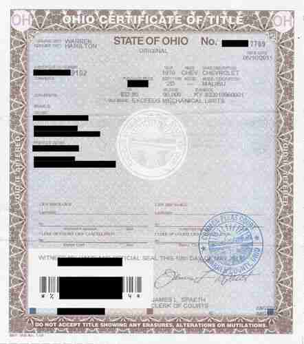 Car has its clear Certificate of Title from Ohio ( as seen in pic) that we never signed, which we will give at the time of transaction. We have the original front and rear bumpers, front grill assembly and radiator support they are not in very good condition but you are welcome to have them. Feel free to go on Ground Up Restoration's website and add up all these parts so you can see just in parts how much is invested.