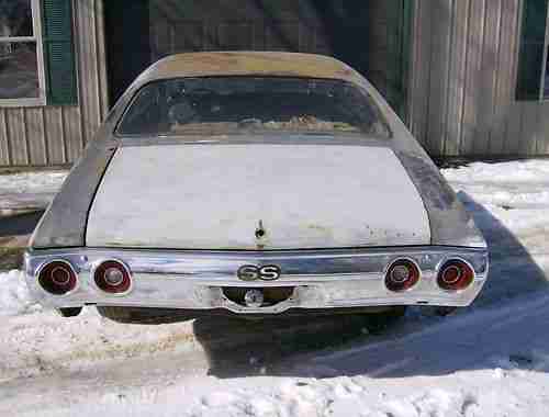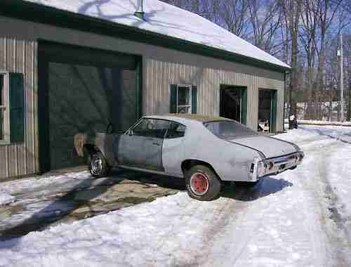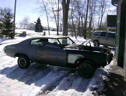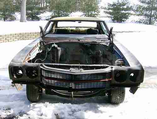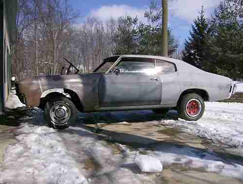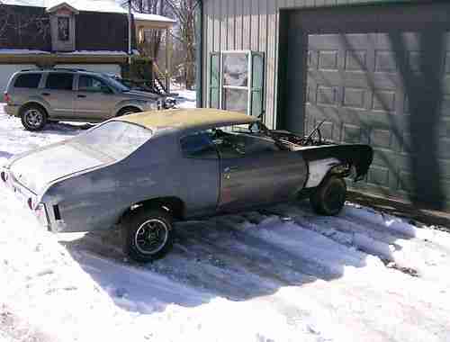YOU ARE LOOKING AT A 1971 CHEVELLE WITH A 1970 CHEVELLE FRONT END ON IT, PRETTY MUCH EVERYTHING THERE TO COMPLETE NO ENGINE OR TRANS, CAR HAS A CLEAR MICHIGAN TITLE,IF SOMEONE WANTS THE 71 FRONT END ON IT I HAVE EVERYTHING TO CHANGE IT BACK FOR YOU EXCEPT GRILL UP TO YOU NO EXTRA COST FOR THAT, THIS IS A AIR CAR, THE FRAME SEEMS TO BE SOLID, THE BODY IS NOT TO BAD THE DECK LID IS SOLID DOORS ARE IN GOOD SHAPE ROCKERS INNER AND OUTER SEEM GOOD FLOOR BRACES SEEM SOLID I INCLUDED SOME NEW HALF FLOOR PANS, YOU NEED A 1 PSC TRUNK WITH NO BRACES THERE ABOUT 150.00 I INCLUDED NEW TANK BRACES AND REAR TRUNK BRACES, AND YOU WILL NEED REAR FLOOR PANS, NO BRACES THE ROOF IS IN GOOD SHAPE VERY SOLID, THE REAR QUARTERS ARE IN OK SHAPE SOMEONE REPLACED THEM WITH HALF QUARTERS THEY COULD BE FIXED UP TO YOU, GLASS IS ALL GOOD EXECEPT FRONT WINDSHIELD IS CRACKED, FRONT MOUNTS ARE SOLID, THE DRIVERS FRONT FENDER IS IN BAREMETAL AND SOLID PASSAGER FRONT NEEDS A PATCH IN BOTTEM BUT REST IS GOOD I WOULD SAVE IT, THERE IS NO HOOD YOU CAN GET A NEW SS HOOD FOR 269.00 AS YOU CAN SEE IN THE PHOTOS PRETTY MUCH EVERYTHING IS THERE TO DO THE CAR, ALL WINDOW CHROME RADIATOR ECT, I PUT THE BUY IT NOW LOW FOR QUICK SALE MOST OF THE CARS I HAVE SOLD DONT MAKE IT THE WHOLE LENGTH OF AUCTION, THE CAR IS SOLD AS IS WHERE IS WITH NO ALLOWANCE SET ASIDE FOR HIGH BIDDER THE PRICE YOU BID IS THE PRICE YOU PAY COME INSPECT THE CAR PRIOR TO BIDDING SO HE OR SHE IS HAPPY WITH PURCHACE,