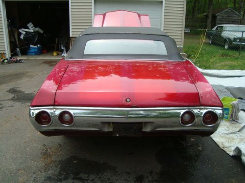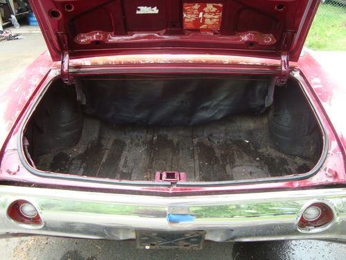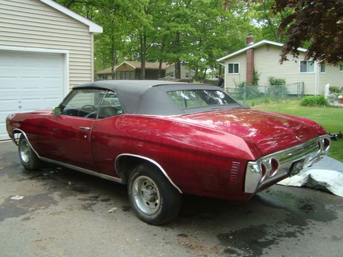 1972 Chevelle Convertible. Two owner car. Original V-8 350(fully rebuilt by 2nd owner in 2008 who was a certified GM mechanic at RAMP Chevrolet for 30 years before passing). The only modifications were HEI ignition conversion(no more points to mess with), polished aluminum intake, and headers. The car was to be stripped and repainted after the motor rebuild was completed in 2008(started with pass fender and stopped see pic). The engine turns freely and I am confident it will run and drive fine. I was told by my mechanic not to start the car without removing the old gas....I was told by others to just start the car.......I will be cautious and NOT start the car. I do know it needs a new battery. The car has been in dry storage in the garage since to 2008 to present day. The car has a new black power top with glass rear window, the inner liner of the top is perfect and the frame skeleton is clean(may have been restored). The car has tinted windows from factory and all glass is clean. The pinch molding around the rear deck is spotless and excellent shape, the A-pillar front windshield moldings are spotless and shine as new, the convertible top bow is in mint condition with original leather wrapping intact(no rust, no bubbles..... very clean). The car has all its original panels. The floors, frame and trunk pan are original and solid(see pics).The original color combo from factory on cowl tag which reads paint code 75 cranberry red is very desirable with the black interior and top. As you can see from the pics the pass fender was taken down to metal and headlight extensions with grill were removed(assuming this was where the resto was started and stopped by the mechanic who was in the process of restoring the exterior of car before he passed). All the parts mentioned are included. The front bumper is missing. I may be able to locate it and if I do It will be included...if the widow who sold me the car cant find it you can locate one on ebay for $75 or brand new repro for $150 in mint ready to use shape(see NPD National Parts Depot). This is a nice solid car that can be used as is or finished to whatever level your wife will let you...lol. The car has never been hit. My mechanic looked over the car and had nothing bad to say. I am not asking a lot for the car.Feel free to call with offers if you are serious. Its offered for sale in my local area and I may end auction early. All are welcome to inspect car before auction end. The car is sold in used as is condition. All international bidders welcome. I will assist and store car in garage until pick up, but transport payment and planning are the buyers responsibility. I will gladly assist with shipper contact if need. I am retired Police Officer....so I have some time on my hand and glad to help if I can. If the car does not sell I will put a bumper on the car and enjoy it this summer. I have a clear title/NY reg ready to transfer to new owner Please feel free to call me with any questions. 631-943-9107 Thank you. First fair offer gets the car.