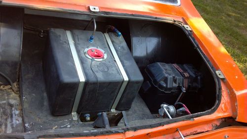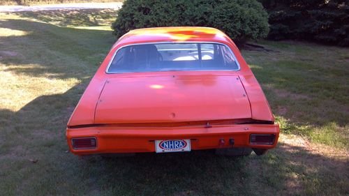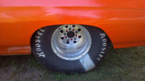 The car has run previously by the prior owners as fast as a Mid/Low 10's pass in the quarter mile previously before I bought it. I purchased the car about 3 years ago and I have done many changes to make it a better drag/street car. I have not raced the car as of yet, but it is race ready as of right now. The car was rewired, the rear end is rebuilt, a lot of new AN fittings, and safety changes and upgrades. This car is very tastefully done and mechanically is very nice. The car could use a paint job. The car is nearly rust free and always was a clean car. The floor pans are original and nearly rust free, the frame is also clean shape, meaning this car has not seen salt or wintertime in decades or if ever. The paint is ok on the car, but is not a show car paint job. The car looks great doing down the road and on the track, but up close it is not a perfect job. When I bought the car it had a lot of racing and contingency decals on it everywhere and the car looked fine. But once I removed them, I found the poor bodywork and paint on the car. I trimmed a lot of weight out of this car since I got it and the cage should be able to certify to 8.50 if necessary. And there is a lot more potential here yet with by adding more fiberglass body panels but I was unsure how far I wanted to go with either wanting a drag car or a street car? The car can be street driven on the street if exhaust system and front turn signals are added to the car now. All the wiring is there for the front turn signals/parking lights. Obviously there is other DOT necessary items missing that would make it 100% streetable like parking brakes, windshield wipers, hazzard lights, etc. but if registered as a hobbyist or Collector, or custom type license it doesn't matter then. The car comes with a clean and clear title if somebody is interested in street driving the car again, and I have contact information of previous owners as well that goes along with the sale.
