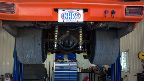 Front suspension is stock type with 3 way adjustable drag shocks, Front Moroso trick drag springs, front weight jack bolts to adjust front end travel, no sway bar