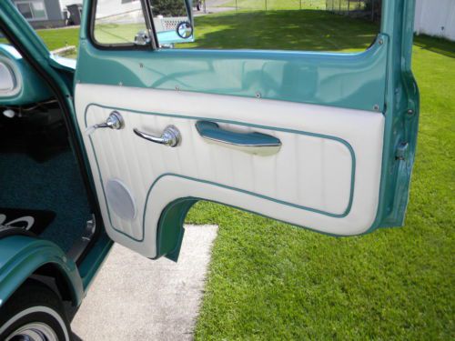 Bright work: Chrome bumpers are original in very good condition with a few scratches on the rear bumper. All bright work is in good to very good condition with some small signs of wear, but very presentable. Windshield chrome strip upgrade. Tail gate reflectors are also an upgrade aftermarket with blue dots on the lights. Polished stainless fasteners used throughout the truck primarily in the bed. Very classy and well done. Chrome bed handles are new.