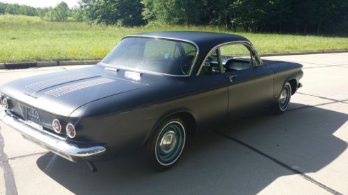 Thisis a 1963 Chevy Corvair with 4 speed manual transmission and a great running 6 cylinder engine. The car is un modified and all original. I've owned this car for 2 years and every time I went out to start it no problem fire every time runs great.I have the car painted flat black last year and was going to use the vehicle for advertising but I have no need for it now. The paint is in very nice condition except for two scratches on the passenger side quarter panel they can easily be repaired.mechanically the car runs great was there only being a issue of the vehicle being hard to shift into second gear is it means a second gear syncros. This car also comes with a second manual transmission that has been rebuilt. It drives straight handles nice and maneuvers down the road at 60 miles an hour just like it was when it was new.I bought the car from the second owner in this vehicles from out west never driven in the Ohio winters. please call 4403155652 with any questions 4 to set up a time to take a look at this vehicle.