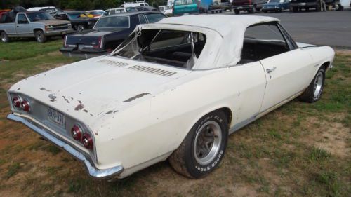 I HAVE A COMPLETE 1966 CORVAIR CORSA CONVERTIBLE. THIS IS THE BEST AND LAST YEAR FOR THE HIGHER PERFORMANCE CORVAIR CORSA WITH LESS THAN 3500 OF THESE MADE (OVER 8000 IN 1965). IN 1965 GM CHANGED THE BODY STYLE TO A MORE SLIMMER LOWER PROFILE CAR. IN 1966 MADE MORE IMPROVMENTS WITH A STRONGER TRANSMISSION AND DIFFERENTIAL THAT THEY KEPT UNTIL THE END OF THE CORVAIR IN 1969. AFTER 1966 YOU COULD GET THE 140 HP BUT NOT IN THE CORSA OPTION WITH FACTORY TACH AND GAUGE SETUP OR THE 180HP TURBO. THIS CAR HAS THE FACTORY RB CODE 140HP ENGINE AND THE CORRECT 4 SPEED TRANSMISSION. ALL CARBURETORS ARE COMPLETE INCLUDING LINKAGE AND FUEL LINES.THIS CAR FROM WHAT I CAN TELL IS UNMOLESTED. ALTHOUGH THE COLOR ON THE CAR IS NOT CORRECT IT WAS ORIGINALY PAINT CODE N MADERIA MAROON METALLIC. IT HAS ALL THE ORIGINAL, NICE, NOT NEW BLACK INTERIOR, NO CRACKS IN DASH PAD, FACTORY GUAGES AND FACTORY AM RADIO. THE CAR WAS BEING DRIVEN WHEN THE BRAKES WENT OUT SO THE CAR HAS BEEN PARKED FOR ABOUT 20 YEARS. ENGINE TURNS, I WOULD NOT TRY TO START IT WITHOUT DOING SOME WORK FIRST( OIL CHANGE, CARB REBUILDS). AS I SAID THE CAR IS 100% COMPLETE NEVER CUT ON OR HACKED UP. ALL SIDE GLASS WORKS PROPERLY, DOORS OPEN AND SHUT. THIS CAR IS VERY RUSTY WOULD NEED REPAIR OR REBODY. I HAVE BEEN INVOLVED WITH CORVAIRS SINCE 1987 AND HAVE OTHER BODIES AND PARTS. I WANT TO BE CLEAR WONT DRIVE YOU HOME AND NEEDS COMPLETE RESTORING. NO TEXTS OR TRADES, CALLS ONLY. THE WHEELS ON THE CAR ARE NOT THE ONES THAT GO WITH THE CAR I HAVE ORIGINAL 13" WHEELS THAT WILL GO ON THE CAR (SEE PICTURE) I AM LISTING THS CAR FOR SOMEONE ELSE SO PLEASE CALL 615-243-4711 FOR ALL QUESTIONS