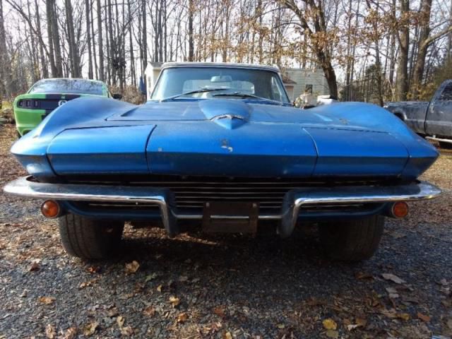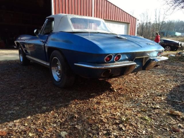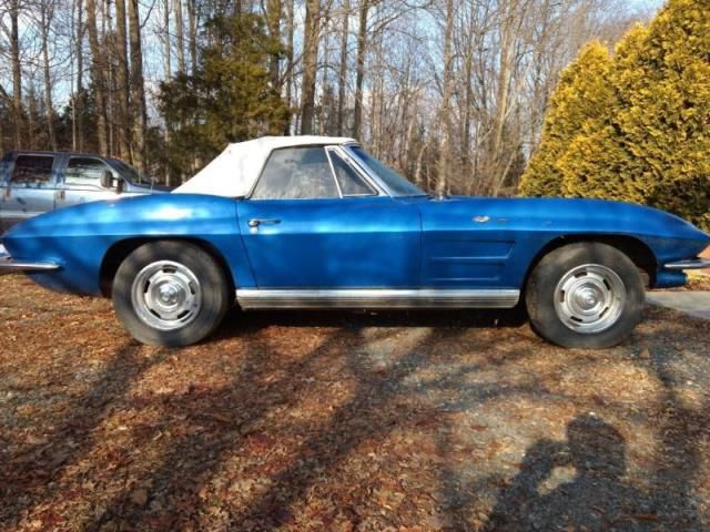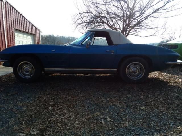Any questions at : sayer.totton@aol.com 1964 Chevrolet Corvette Stingray convertible. Has original numbers match ingengine, transmission, rear and carb. Engine is a 327 followed by a close ratio Muncie 4 speed gearbox to a posi rear. Car runs and drives fine. Has had recen t brakes installed. In the past year it has had a new fiberglass rear spring , newrear bushings, new gas tank and new alternator/ voltage regulator installed.Interior is original. Car was painted blue in the late 70s by previous owner.Odometer shows 06163 miles. Pretty sure that is not actual mileage. Frame is ingood condition, car has been stored inside most of the time.