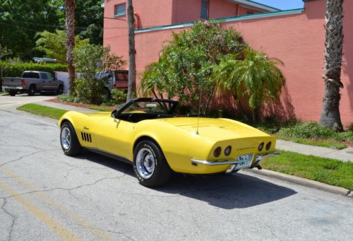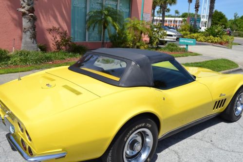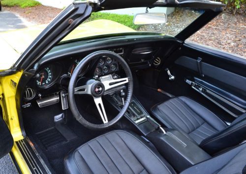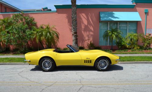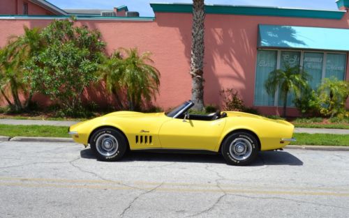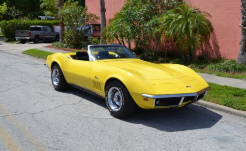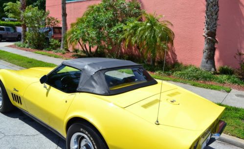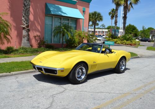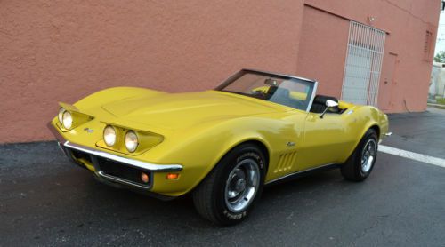 1969 Chevy Corvette Stingray Convertible for Sale. Corvette Stingray and GM enthusiasts take a look! Double sharp Daytona Yellow Corvette with contrasting black top and black interior that is ready to cruise! Powered by a 350 CI (numbers matching engine block) and backed with an automatic transmission. Accessories include power steering, four wheel power disc brakes, and factory air conditioning, AM/FM radio. This very desirable Metal Bumper collectible rides on a set of Rally Rims with raised white letter radials in 225/70R 15 on all four corners. Great looking and fun to drive! This Stingray will provide hours of enjoyable cruising while increasing in value!