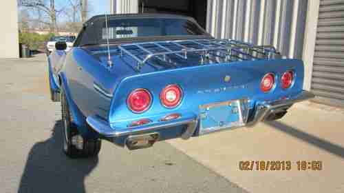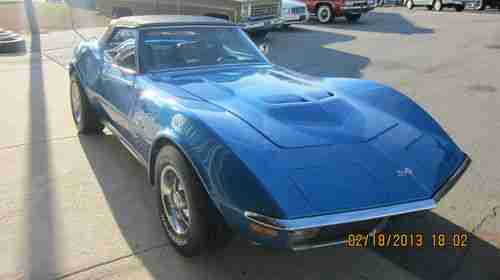 1971 CORVETTE CONV AUTO. AIRCOND. MATCHING #S 350-270 HP. DETAILED UNDERHOOD. NICE PAINT AT LEASED AN 8 0N A SCALEOF 1-10. BFG RADIALS. NEW BLACK TOP NICE INTERIOR. HAS LT-1 HOOD. CHROME IS NICE. AN RUBBERS AN WEATHERSTRIP IS GOOD. BLUE WITH BLACK INTERIOR AN BLACK TOP. 91000 ORIG MILES. SOLD WITH GA BILL OF SALE AN GA REGESTRATION. NICE CLEAN UNDERCARRIGE. RUNS AN DRIVES GREAT. ALSO HAS POWERSTEERING AND BRAKES.CALL WITH QUESTIONS OR OFFERS THANKS 770 535 7311
