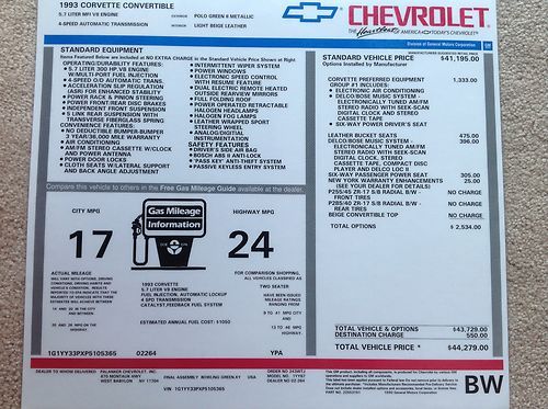 May 2014 PA inspection and emissions with $1,900 worth of work done over the past two years including new rear brake rotors, pads, spark distributor, wire, plugs. Car comes with original window sticker, GM factory build sheet and 1993 Corvette brochure. Car has only 3 small/barely noticeable paint blemishes/scratches, one on driver side door mirror, one on low side drivers door, and one on the rear bumper that has been professionally touched up, pictures included. The power headlight motor that flips the headlight door open and closed continues to run a few seconds after headlights have turned. Haven't had time to address what the problem is, but the headlight doors function/work fine.