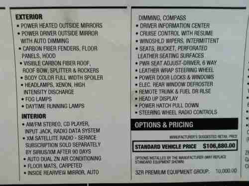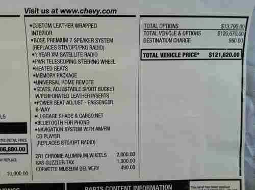 Options: Navigation, 3ZR Package $10k optn, Bose Premium 7 speaker system, Custom Leather Wraped Interior, Power Telescopic Steering Wheel, Fog Lights, Bluetooth, Dual Mode 4in Exhaust Tips w Remote, XM Satellite Radio, Chrome ZR1 Wheels $2000 option, Leather Seats, CD Player