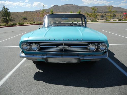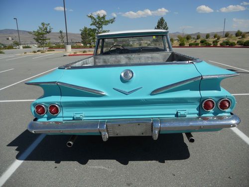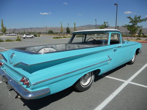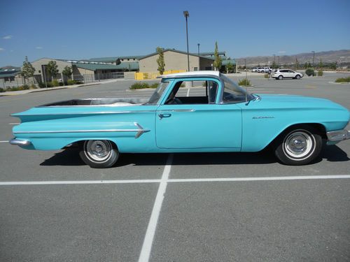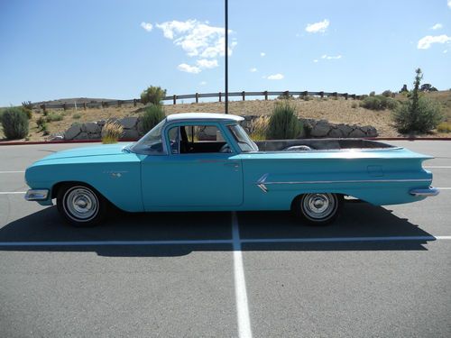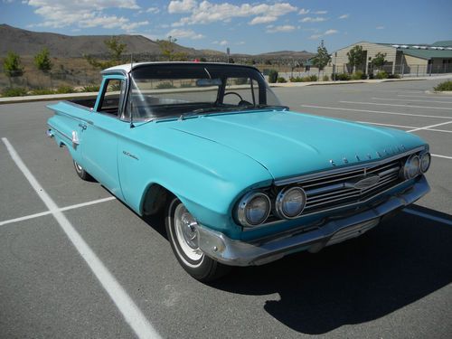 1960 Chevy El camino, small block V8, manual transmission (3 on the tree). The body is in good shape, paint is old, some rust on the floor pans, the interior is nice, the engine runs and sounds good, the transmission works great, drives nice, the brakes feel good but I did not check them, the driver side window is cracked, could use tires and a few basics (belts, hoses etc.). Over all it is in good shape and a great start to restore or just enjoy as it is. Good luck and thanks for looking.
