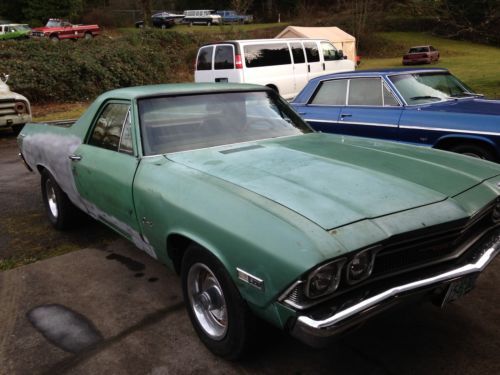 For Sale: 1968 Chevrolet El Camino 350 4-speed!!! Strong running engine with BIG cam, headers and new bullet mufflers with turn downs! Aftermarket aluminum intake manifold, valve covers and Edelbrock carb. Has HEI ignition as well! It has a Hot Rod Hurst shifter linkage with a separate reverse lever for safety. Nice Chevrolet Rally Wheels with excellent tires! Very solid body with very little rust. The drivers floor pan was patched by a previous owner....it's functional but could be better. There are some pinholes in the floor behind the seat on the drivers side that will need a patch. There looks to be some rust forming in the lower corners of the rear window under the trim as usual but all in all a very solid rust free Northwest vehicle!!! The interior will need redone but it's all there except the passengers side door panel. The primer on the passengers side is there due to a dent that was removed above the wheel well according to the previous owner. It appears the door was replaced as well. The El Camino has a KILLER stance and sounds Bad AZZ!!! This would be a great father/son project or just a daily cruiser!