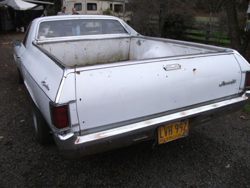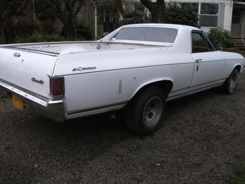 1968 Chevrolet EL CAMINO 23 MORE pictures to be added 11/18 Also, I do have the hood and it will be installed with the new pictures(if you want more contact me) Small Block, Automatic transmission, Holly 4 Barrel Carb, headers with thrush mufflers. Been off road since 1999, fresh from an estate sale. Vehicle started right up with good oil pressure and sounds amazing with no exhaust leaks. Brakes work great. Went through all gears it shifted fine and stops great. Perfect candidate for a complete restoration or fix the small things and would make a great daily driver. I have done the following: Drained fuel tank Installed new distributor cap, rotor and condenser, points, Cleaned carb Push button start Body is straight and looks good All Glass is good All chrome is in fair to good condition (missing gutter pieces and bumpers have some rust on them) Might need ignition switch One tail light stays on & needs attention Blinker needs work Trans shifter on floor need WD40 or? (a little stiff) Paint is OK, hood has been repainted No carpet (pulled out to check for rust through see notes on rust through) ONLY Rust through is a small hole in lower drivers side fender and drivers door(see pics) Good seat core, needs upholstered Lower radiator mount needs attention Needs tires Need more pictures? Send your request and I will send some back. This truck is sold "AS is, Where is" with buyer being responsible for all costs and arrangements for the removal of the pickup from Seller. Vehicle must be removed within 14 days unless other arrangements are made with seller. Just keep me informed and communicate. This is a binding agreement if you bid so please email me with your questions prior to bidding. If you would like to talk to me send your phone number and I will be glad to call you back. A deposit of $500 is due within 24 hours of auction close by Paypal and the balance of CASH within 7 days of auction close. If you need to make other arrangement contact me prior to bidding. Seller will not release vehicle or title until all funds are cleared. If you cannot do cash I will consider wire. Yes I will sale to a international buyer. Happy bidding and thanks for looking. |