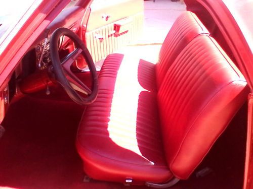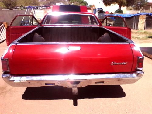 it has a 2 speed power glide automatic transmission, rear end is a 10 bolt car runs nice and very strong. The exterior has been freshly painted with a red perl metallic; it changes from darker maroon in the shade, to a red in the sun. The hood is striped black with custom painted pinstripes and the interior is all new from carpet to dash-pad and visor to seat. red on red, the car turns heads. comes with a clear az title. The car is rust free. looking for nice el camino look no further and bid here!! Feel free to ask questions I answer soon as possible. buyer is responsible for all shipping costs. Car is used but look better than new; being sold as is no warranty. serious buyers only!!! If you have 0 feedback you must contact before bidding or your bid will be retracted. Thanx for looking and good luck bidding. |