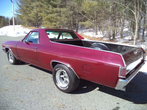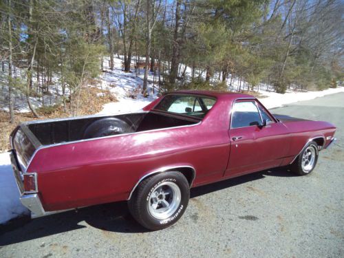 1968 CHEVROLET EL CAMINO WITH A STRONG RUNNING 350. ALUMINUM INTAKE. AUTOMATIC TRANSMISSION. POWER STEERING. NICE MAROON EXTERIOR WITH A BEAUTIFUL BLACK INTERIOR. THIS EL CAMINO RUNS AND DRIVES GREAT. MANY NEW UPGRADES. NEW WHEELS AND RAISED WHITE LETTERED TIRES, 3 INCH DUAL FLOW MASTER EXHAUST WHICH SOUNDS AWESOME. NEW GAS TANK ETC. EVERYTHING SEEMS TO WORK FINE INCLUDING LIGHTS, HORN, WIPERS, HEATER. BLINKERS AND SO ON. THIS COULD BE USED AS A DAILY DRIVER. PLEASE CALL WITH ANY AND ALL QUESTIONS BEFORE BIDDING AT (888)-838-8776