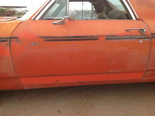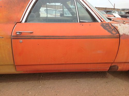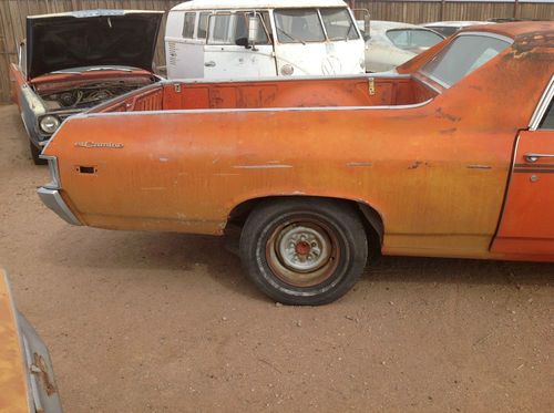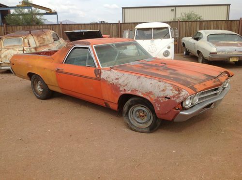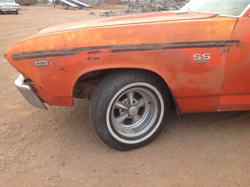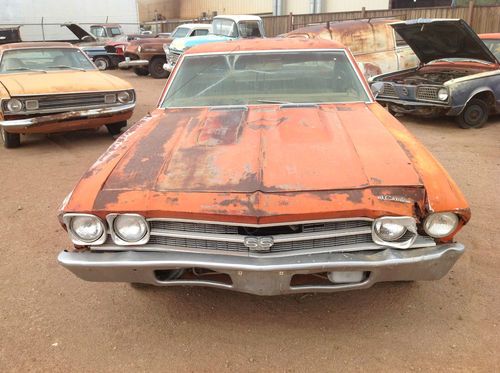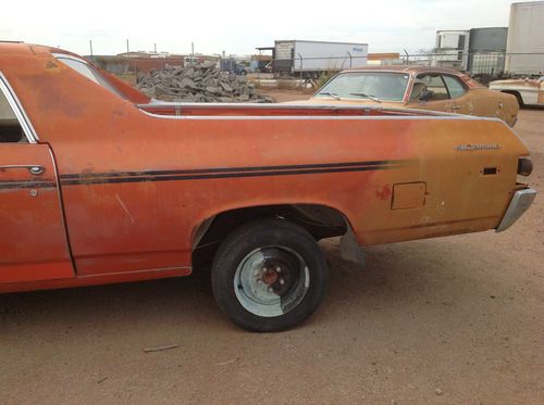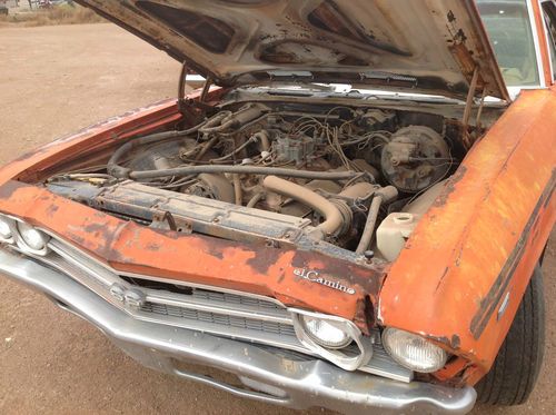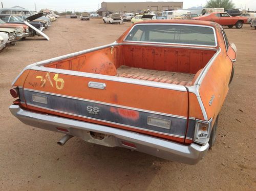 This is a 1969 Chevrolet El Camino SS 396. Very nice, but sunbeaten truck. The JK stamping on the block indicates a 1969 Chevelle or El Camino 325 horse 396 cubic inch engine. Good body, with some bumps and bruises. Looks to be a factory A/C car with column shift turbo 400 transmission. The vehicle is not currently running and hasn't for 30 plus years. Very original with front disc brakes an 12 bolt rear end. The 72 72 paint code indicates a Monaco Orange color that was mandatory SS 396 package. Only 2 colors had this distinction in 1969, Monaco orange and Daytona Yellow. Super rare El Camino. If you have any questions, please call 435-770-3337. Thanks