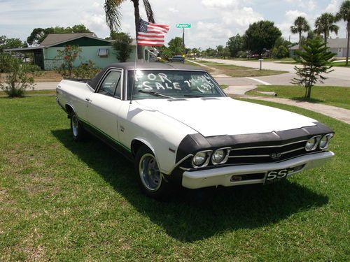 1969 chevy el camino ss, black vinal top, automatic, power steering, power brakes, bucket seats, console, coloum shifter stock, tach, gauges, original ss 14" rimes with beauty rings, and ss centers. duel 2/12 exhaust, wheel well mouldings, ss hood, 454 engine. took 396 out years ago. 396 SS grill emblem,396 SS rear tail gate emblem, SS emblems on fenders say 454 which is correct for the engine size. good running engine , starts right up, mostly stock car a few changes, but really a nice car. garge kept adult driven, can be really up graded and be made into a show quality at some time. body is good paint is 2 years old burt is slightly faded white but can be rubbed out. fast and clean car. call for serious bidding 786 306 6335. DO NOT BID IF YOU ARE GOING TO BE ARGUEMENTIVE or looking for a perfect car. I am selling at a good price and know that this car is hard to find in this condition. the engine has no more than 50 miles on it since 2009. i have other projects to work on. i know with little time and work this car can be brought up to a 23,000 car. good bidding.