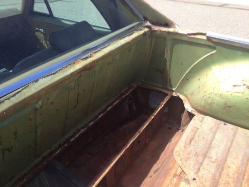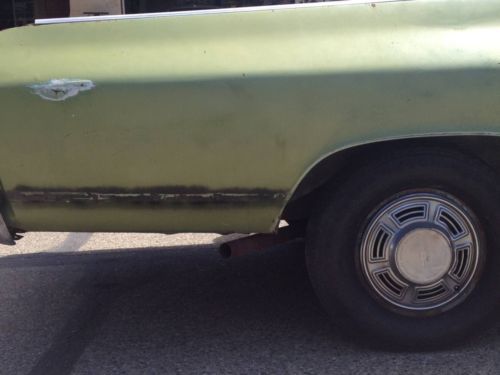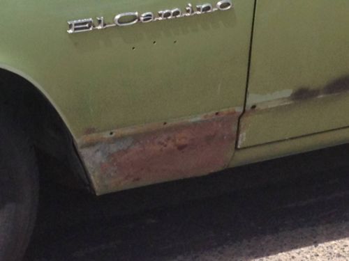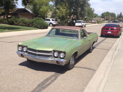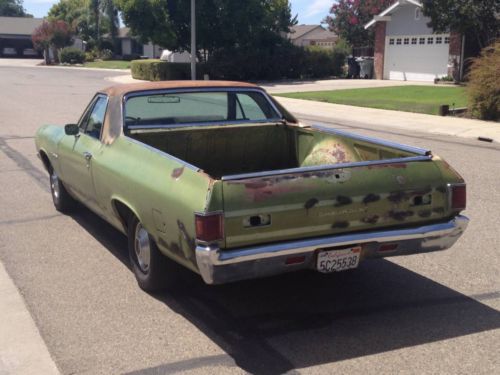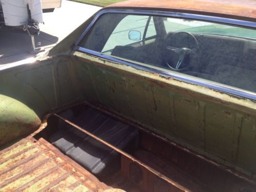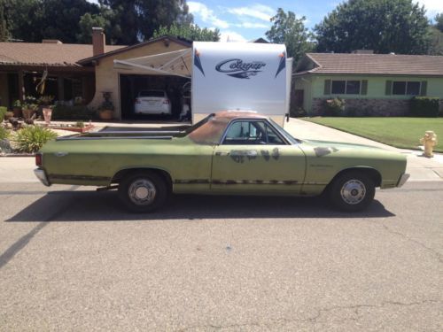 1970 Chevrolet El Camino - Fresh from the fields of Los Angeles, California. Car is original to California. Car was assembled in the Van Nuys plant. This El Camino came from the factory with the Malibu trim package, green vinyl top (removed), power steering, power disc brakes, and factory A/C. Drive train is Chevy 350 with auto 350 trans. Car is ready for some minor TLC or complete restoration. Car runs, moves, and stops on its own (in need of a tune up). Once the cobs webs and fox tails were removed, she fired right up. Carb has been rebuilt. New coil and points installed. We have driven the car around the yard. What you see is what you get. Car has very minimal rust. Floors seem to be solid. Rot on lower fender corners and small area at back window. Some trim pieces are missing. Trim shown in pictures is what is available with the car. California title and registration is clear, currently on a non-op. Please ask all necessary questions prior to bidding. Thank You. Available by phone (559) 802-7592. |